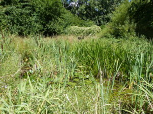 Le long du Riez se trouve un linéaire de saules têtards, arbres composés de micro-milieux écologiques très intéressants pour la faune et la flore. La partie centrale du site est une prairie fauchée une fois par an à l’automne. Au milieu de cette prairie, une mare a été aménagée. Sa présence permet l’installation d’une faune et d’une flore aquatiques, ce qui renforce encore la biodiversité du terrain. Enfin, plusieurs haies encadrent la prairie. Elles sont composées d’essences locales (viorne mancienne, églantier, cornouiller, noisetier…) les plus adaptées à l’accueil de la faune de notre région.